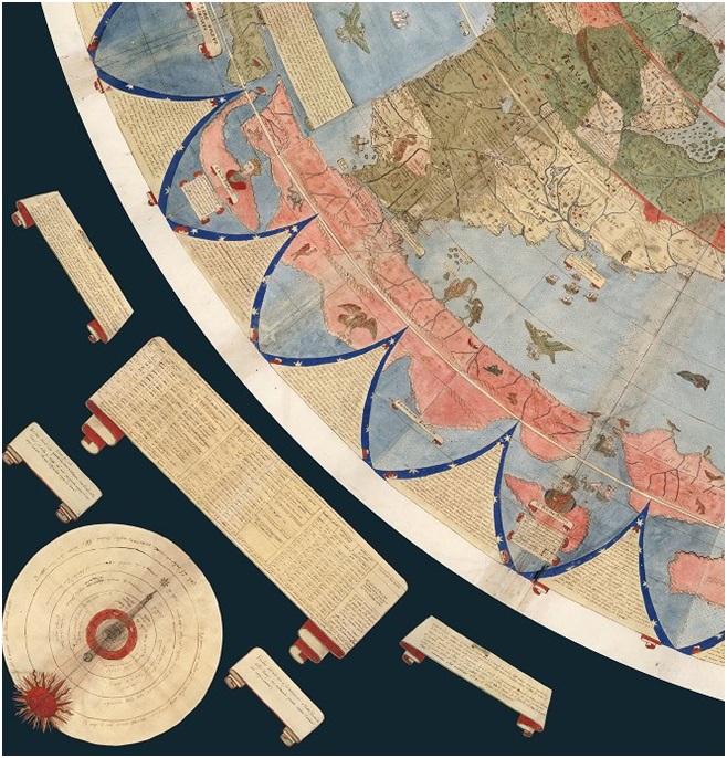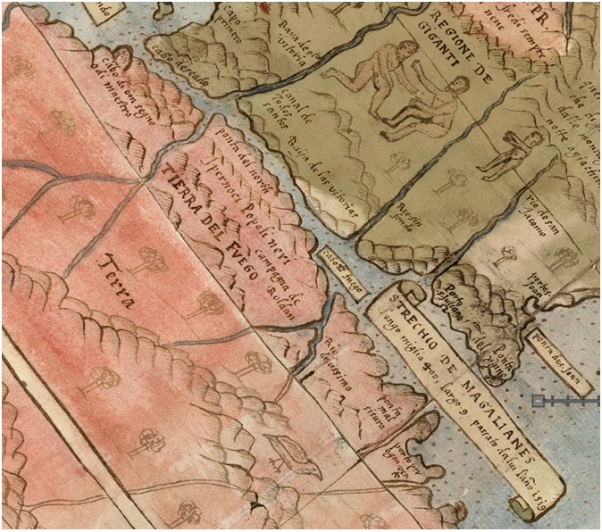 In our modern terms the southernmost part of South America lies in this direction, and the land coloured in red is designated “Terra del Fuego” which means land of fire.